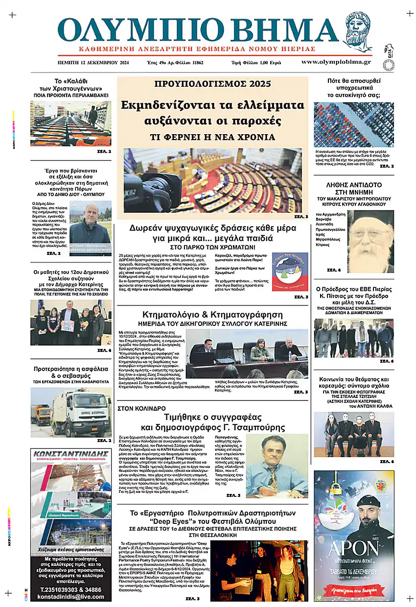 Το πρωτοσέλιδο της εφημερίδας Ολύμπιο Βήμα για την Πέμπτη, 12 Δεκεμβρίου 2024