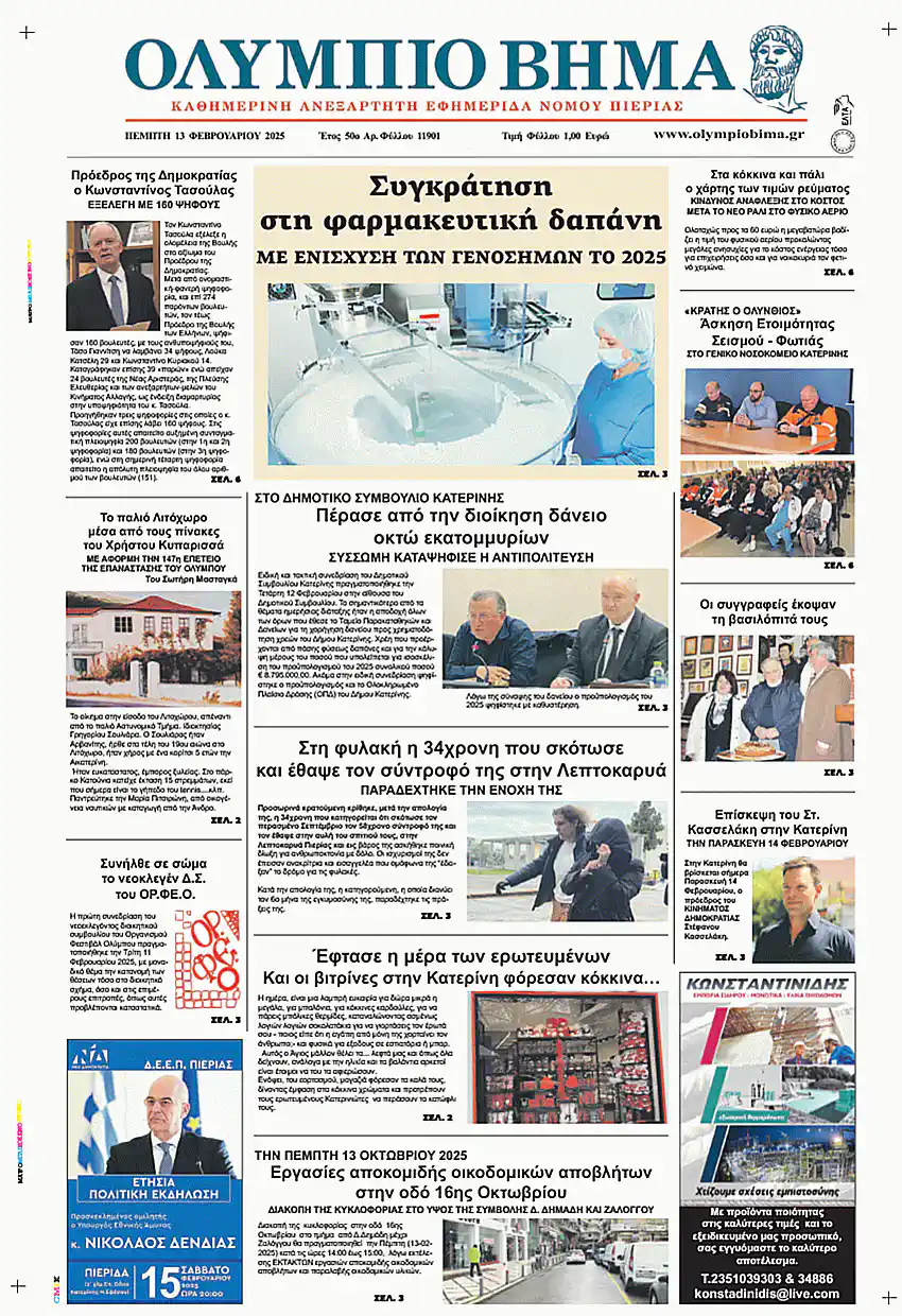 Το πρωτοσέλιδο της εφημερίδας Ολύμπιο Βήμα για την Πέμπτη, 13 Φεβρουαρίου 2025
