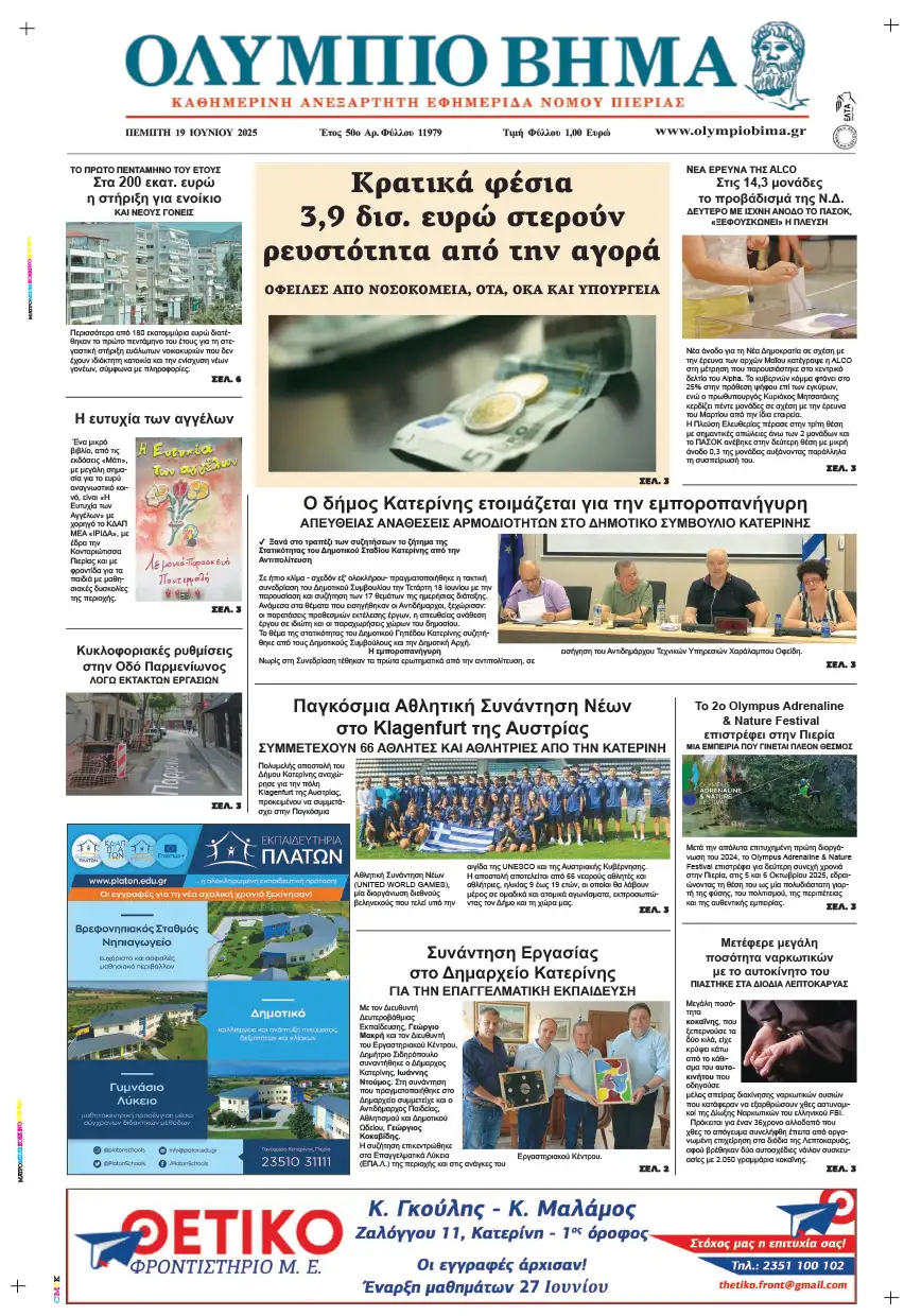 Το πρωτοσέλιδο της εφημερίδας Ολύμπιο Βήμα για την Πέμπτη, 19 Ιουνίου 2025