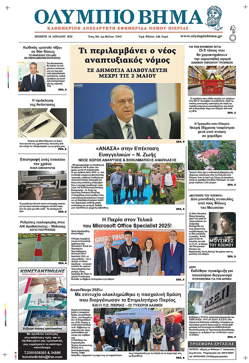 Το πρωτοσέλιδο της εφημερίδας Ολύμπιο Βήμα για την Πέμπτη, 24 Απριλίου 2025