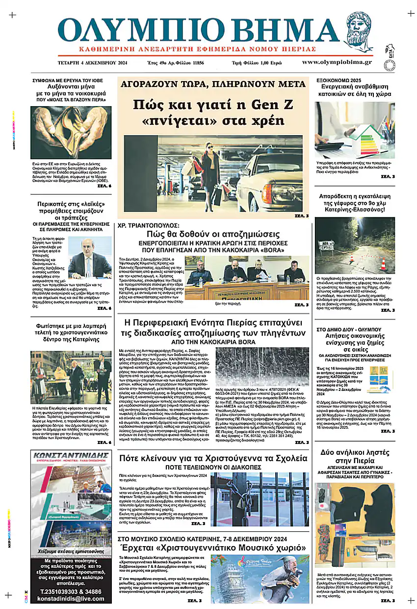 Το πρωτοσέλιδο της εφημερίδας Ολύμπιο Βήμα για την Τετάρτη, 04 Δεκεμβρίου 2024