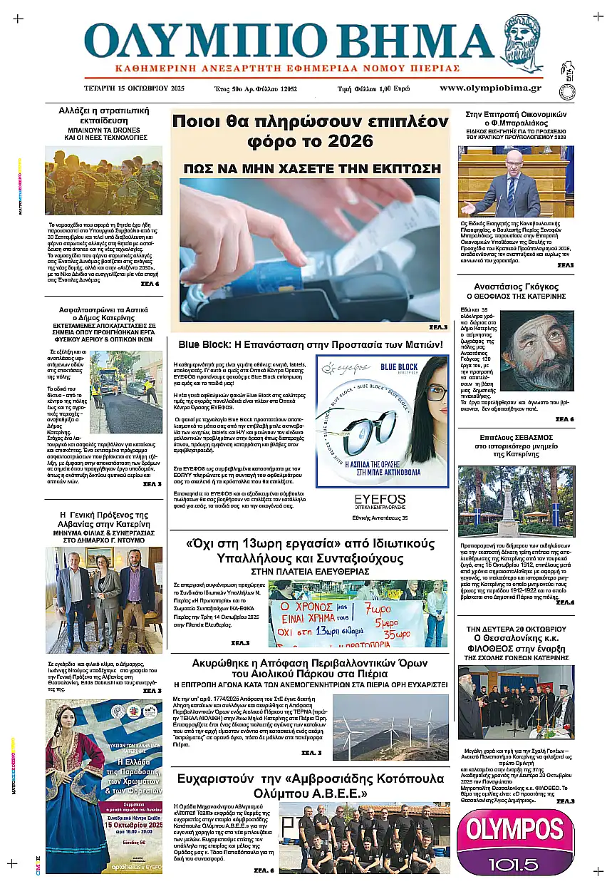 Το πρωτοσέλιδο της εφημερίδας Ολύμπιο Βήμα για την Τετάρτη, 15 Οκτωβρίου 2025