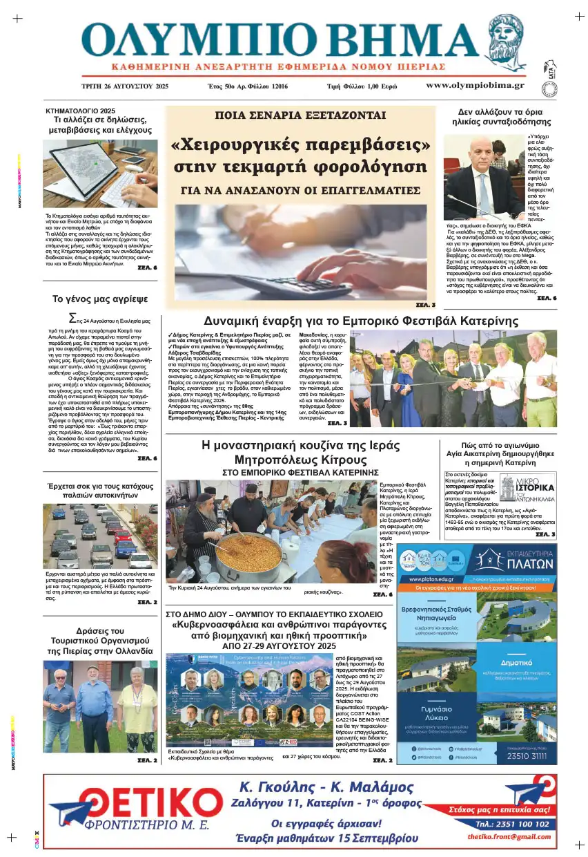 Ολύμπιο Βήμα – Πρωτοσέλιδο για την Τρίτη, 26 Αυγούστου 2025