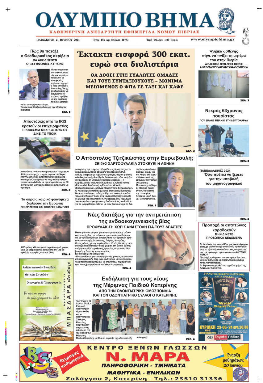 Το πρωτοσέλιδο της εφημερίδας την Παρασκευή, 21 Ιουνίου 2024