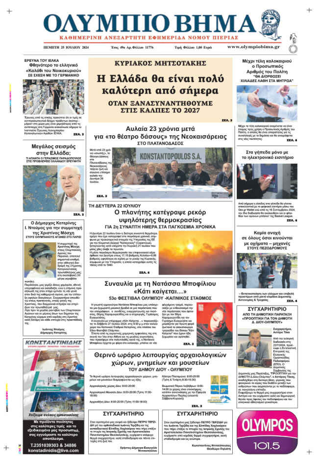 Το Ολύμπιο Βήμα είναι η ιστορική ημερήσια εφημερίδα της Πιερίας με έδρα την Κατερίνη, που προσφέρει αξιόπιστη τοπική ενημέρωση σε πολιτική, κοινωνία, πολιτισμό, οικονομία και αθλητισμό, τόσο έντυπα όσο και ψηφιακά