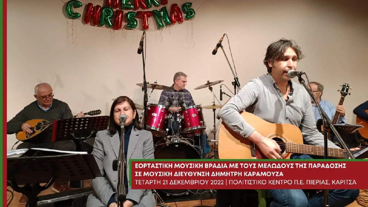 Στο Πολιτιστικό Κέντρο της Περιφερειακής Ενότητας Πιερίας στην Καρίτσα οι “Μελωδοί της Παράδοσης” παρουσίασαν την Τετάρτη 21 Δεκεμβρίου 2022 ένα μουσικό ταξίδι με τραγούδια της Μικράς Ασίας και του Απόστολου Καλδάρα. Η βραδιά πλημμύρισε με παραδοσιακούς ήχους από το κανονάκι, το μαντολίνο, το λαούτο, υπό την καλλιτεχνική διεύθυνση του Δημήτρη Καραμούζα. Η βραδιά έκλεισε με παραδοσιακά κάλαντα από ολόκληρη την Ελλάδα.