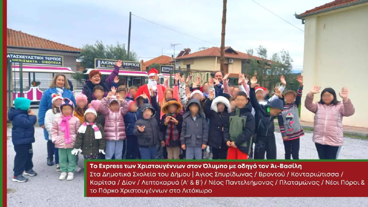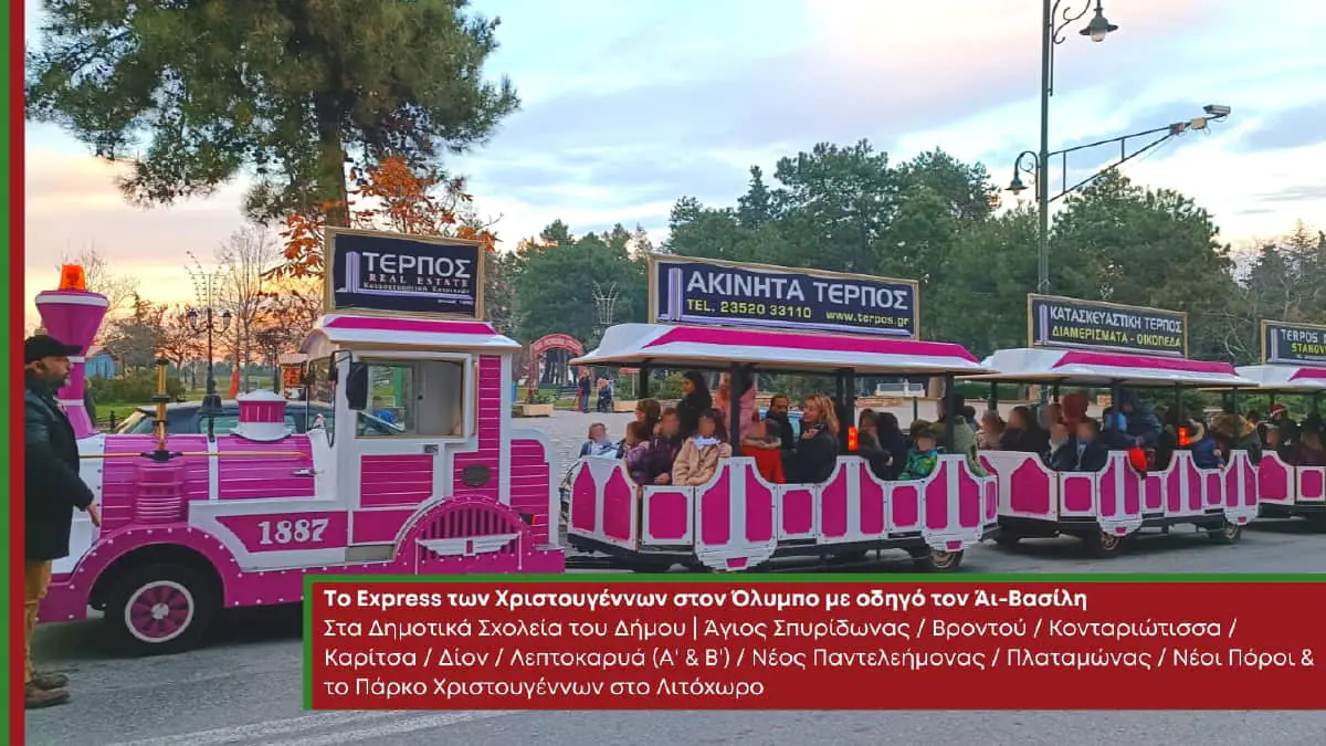 Επίσης, με οδηγό τον Άγιο Βασίλη, το Express των Χριστουγέννων ταξίδεψε και φέτος στον Όλυμπο και επισκέφτηκε τα δημοτικά σχολεία των Δημοτικών Ενοτήτων Ανατολικού Ολύμπου και Δίου. Το χριστουγεννιάτικο τρενάκι συνάντησε επίσης από κοντά μικρούς και μεγάλους επιβάτες στο Πάρκο Χριστουγέννων στο Λιτόχωρο. Ο Άγιος Βασίλης ανανέωσε το ραντεβού του με τους αγαπημένους του επιβάτες για τα Χριστούγεννα του 2023.