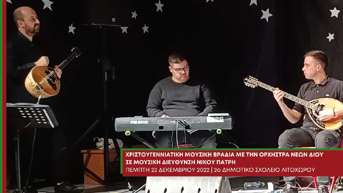 Την Πέμπτη 22 Δεκεμβρίου 2022 η Ορχήστρα Νέων Δίου, υπό τη μουσική διεύθυνση του Νίκου Πατρή παρουσίασε ένα εορταστικό μουσικό πρόγραμμα στην αίθουσα εκδηλώσεων του 2ου Δημοτικού Σχολείου Λιτοχώρου. Οι ταλαντούχοι νέοι μουσικοί και ερμηνευτές παρουσίασαν κάποια από τα μεγαλύτερα κλασικά τραγούδια της ελληνικής δισκογραφίας καθώς και σύγχρονα αγαπημένα τραγούδια σε έντεχνα και ελαφρολαϊκά μονοπάτια. Τη βραδιά άνοιξε με το χαιρετισμό της η πρόεδρος του Κέντρου Γραμμάτων και Τεχνών Δίου, Μαρία Γκριμούλα.