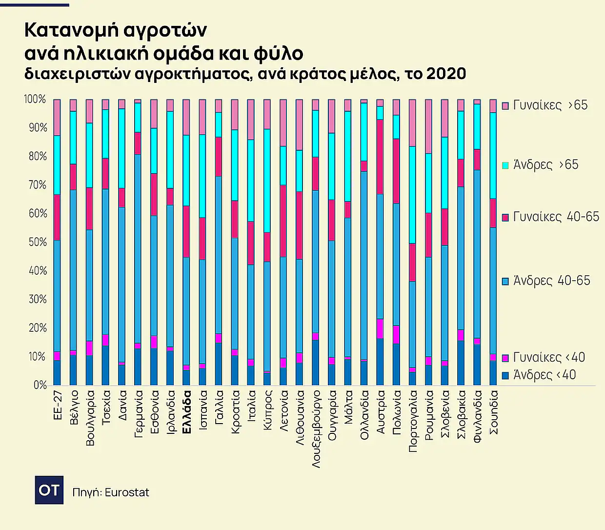 Ο μέσος όρος ηλικίας των Ελλήνων διαχειριστών αγροτικών εκμεταλλεύσεων έχει φτάσει τα 57 έτη, ενώ λιγότερο από 1 στους 10 είναι κάτω των 40