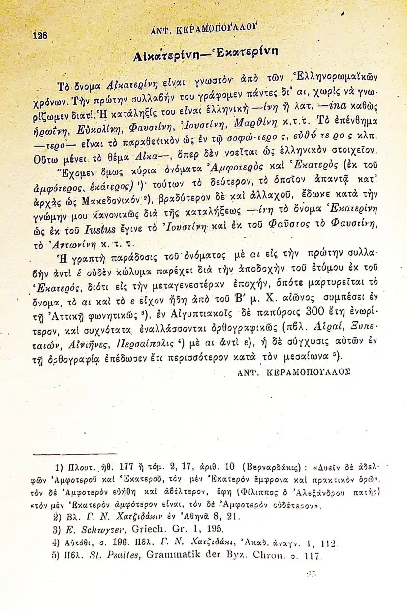 Ο Κεραμόπουλος Θεωρεί την κατάληξη της λέξης Αικατερίνη ελληνική, ενώ κάνει αποδεκτή την παράδοση του ονόματος «εκ του Εκατερός, διότι εις την μεταγενεστέραν εποχήν, οπότε μαρτυρείται το όνομα, το αι και το ε είχον ήδη από του Β΄ μ. Χ. αιώνος συμπέσει εν τη Αττική φωνητικώς».