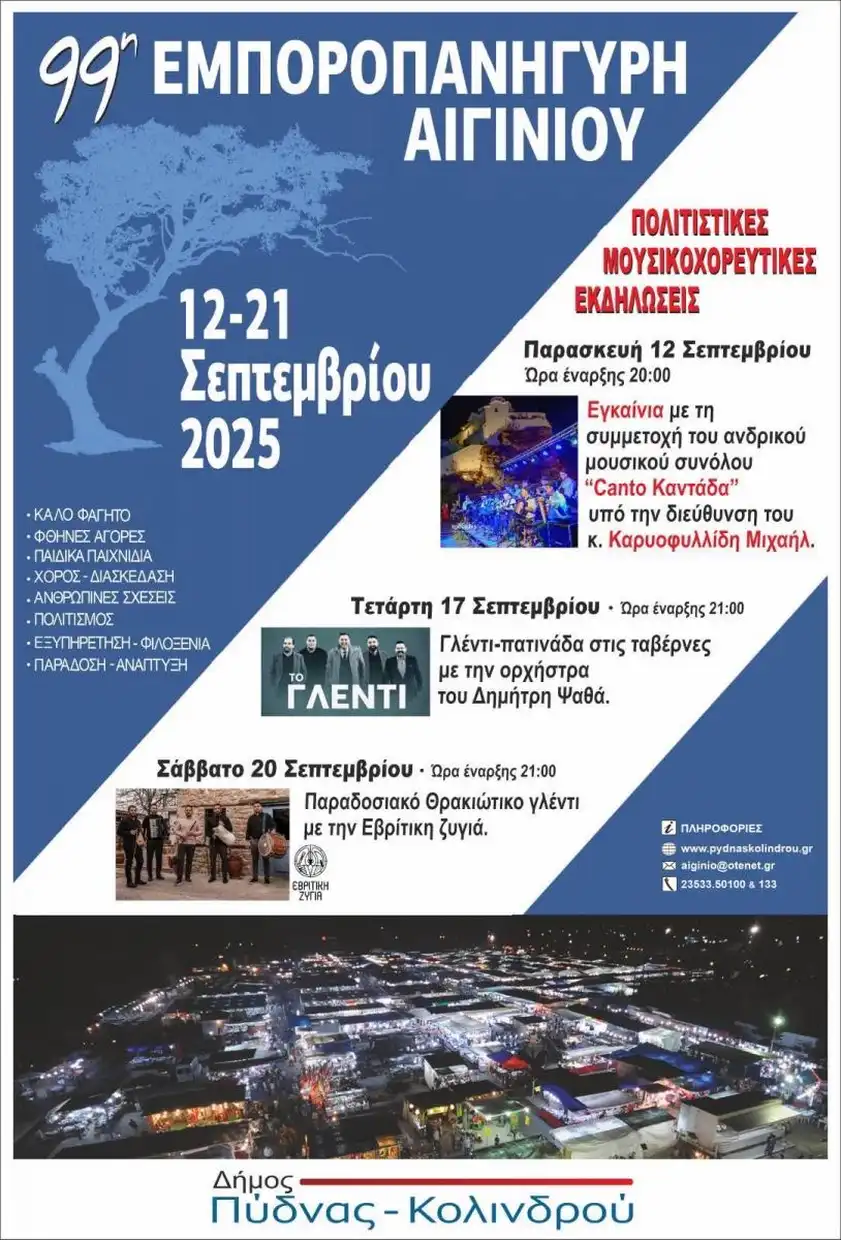 Η Εμποροπανήγυρη Αιγινίου δεν περιορίζεται μόνο στο εμπόριο. Πολιτιστικές εκδηλώσεις, μουσικά σχήματα, τοπικά γλέντια και γαστρονομικές εμπειρίες δίνουν στο φεστιβάλ χαρακτήρα ζωντανής γιορτής. Τα δρώμενα των ημερών αποτελούν έναν θεσμό που ενώνει το παρελθόν με το παρόν και διατηρεί ζωντανή την παράδοση, ενισχύοντας την οικονομία.