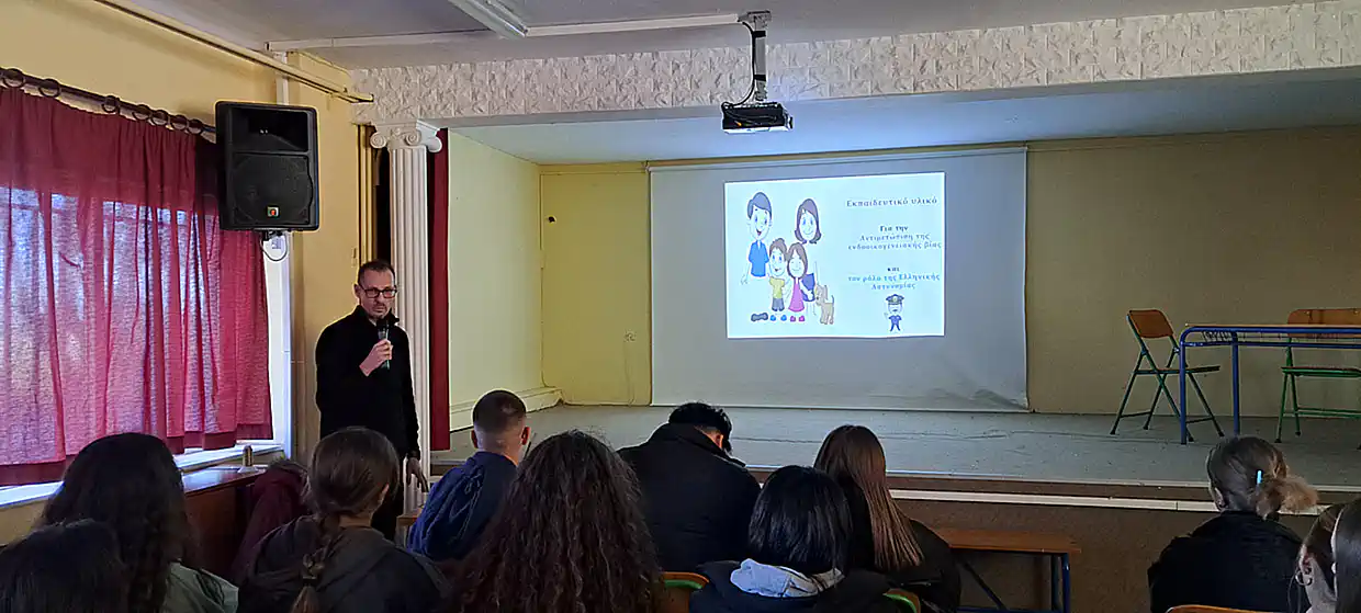 Ο κ. Μυρίσας Γεώργιος αστυνομικός υποδιευθυντής προϊστάμενος γραφείου ενδοοικονειακής βίας παρουσίασε με σαφή και κατανοητό τρόπο τις μορφές της ενδοοικογενειακής βίας, τα σημάδια που μπορεί να υποδεικνύουν τέτοιες καταστάσεις, καθώς και τις συνέπειες που έχουν τόσο στα θύματα όσο και στους θύτες. Οι μαθητές και οι μαθήτριες είχαν την ευκαιρία να θέσουν ερωτήσεις και να εκφράσουν τις ανησυχίες τους, ανταλλάσσοντας απόψεις.