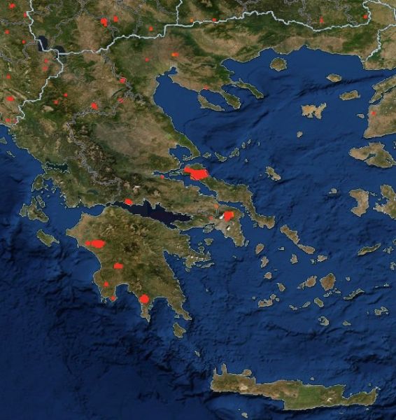 Σοκάρει η εικόνα με τα φλεγόμενα μέτωπα στην Ελλάδα, όπως μεταδίδεται σε πραγματικό χρόνο στην υπηρεσία FIRMS (Fire Information for Resource Management System) της NASA.