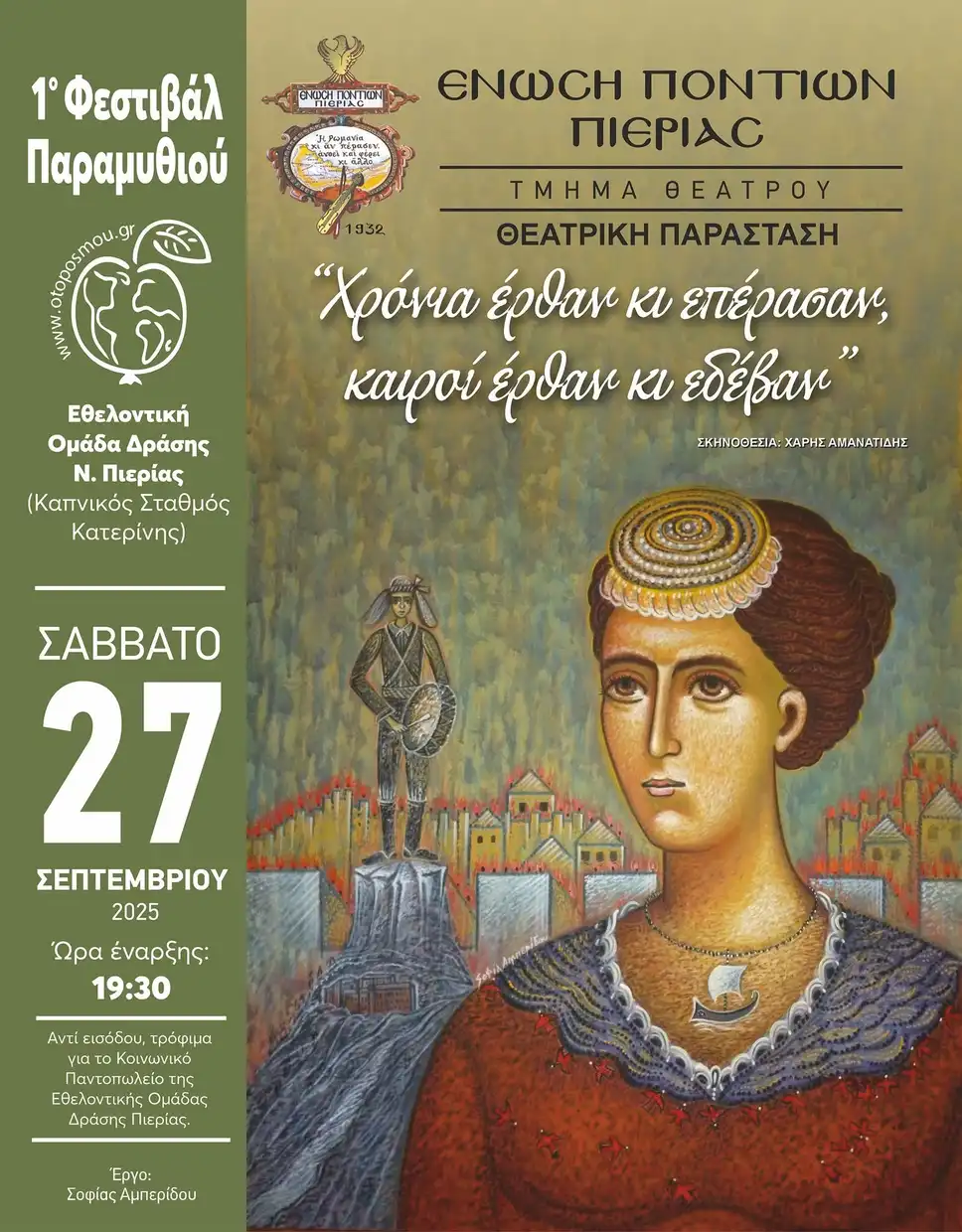Η Ένωση Ποντίων Πιερίας, ανταποκρινόμενη στην ευγενική πρόσκληση της Εθελοντικής Ομάδας Δράσης Πιερίας, με χαρά συμμετέχει με το Θεατρικό της τμήμα, στο 1ο Φεστιβάλ Παραμυθιού, το Σάββατο στις 27 Σεπτεμβρίου 2025 και ώρα 7:30μ.μ., στον Καπνικό Σταθμό Κατερίνης.