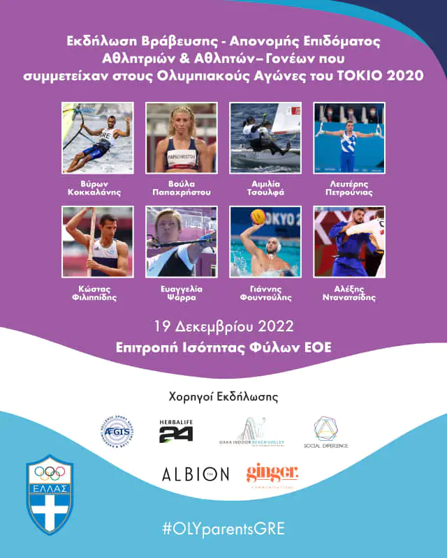 Η Επιτροπή Ισότητας Φύλων της Ελληνικής Ολυμπιακής Επιτροπής διοργανώνει για πρώτη φορά εκδήλωση βράβευσης για τις αθλήτριες και τους αθλητές που ήταν γονείς όταν συμμετείχαν στους Ολυμπιακούς Αγώνες του Τόκιο 2020.