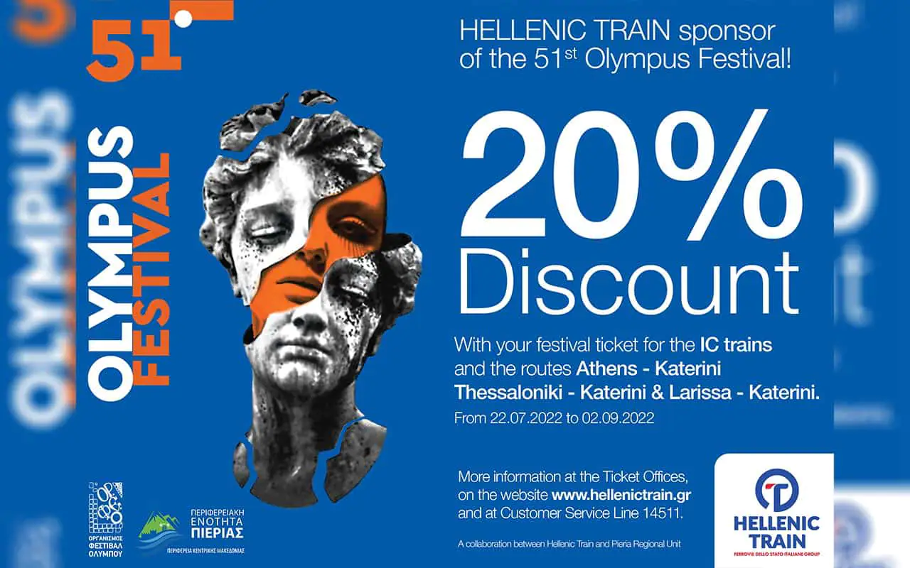 Συγκεκριμένα με την επίδειξη του εισιτηρίου παράστασης του Φεστιβάλ Ολύμπου, στα τρένα Intercity για τη διαδρομή Αθήνα – Κατερίνη, Θεσσαλονίκη – Κατερίνη και Λάρισα – Κατερίνη, θα δίνεται έκπτωση 20% στα εισιτήρια.
