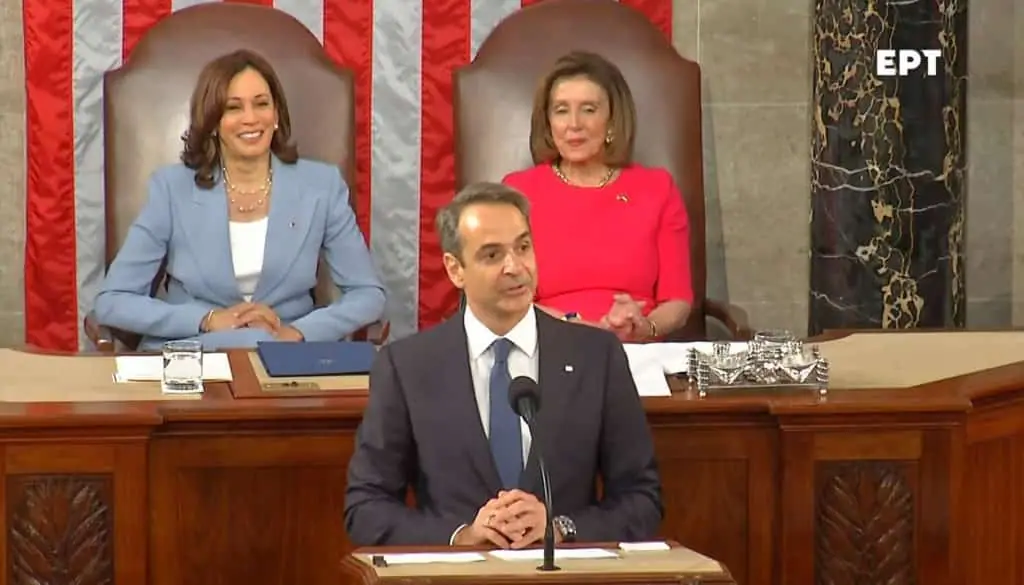 Με την φράση: «Δεν υπάρχει μεγαλύτερη τιμή για τον εκλεγμένο ηγέτη του λαού που δημιούργησε τη δημοκρατία να απευθύνεται στους αιρετούς του λαού που υπεραμύνθηκαν των δημοκρατικών ιδεωδών από τη στιγμή της δημιουργίας του κράτους τους», ξεκίνησε την ιστορική ομιλία του στα μέλη του Κογκρέσο των ΗΠΑ ο Κυριάκος Μητσοτάκης, ο πρώτος Έλληνας πρωθυπουργός που μιλά ενώπιον των μελών των δύο αμερικανικών νομοθετικών σωμάτων.