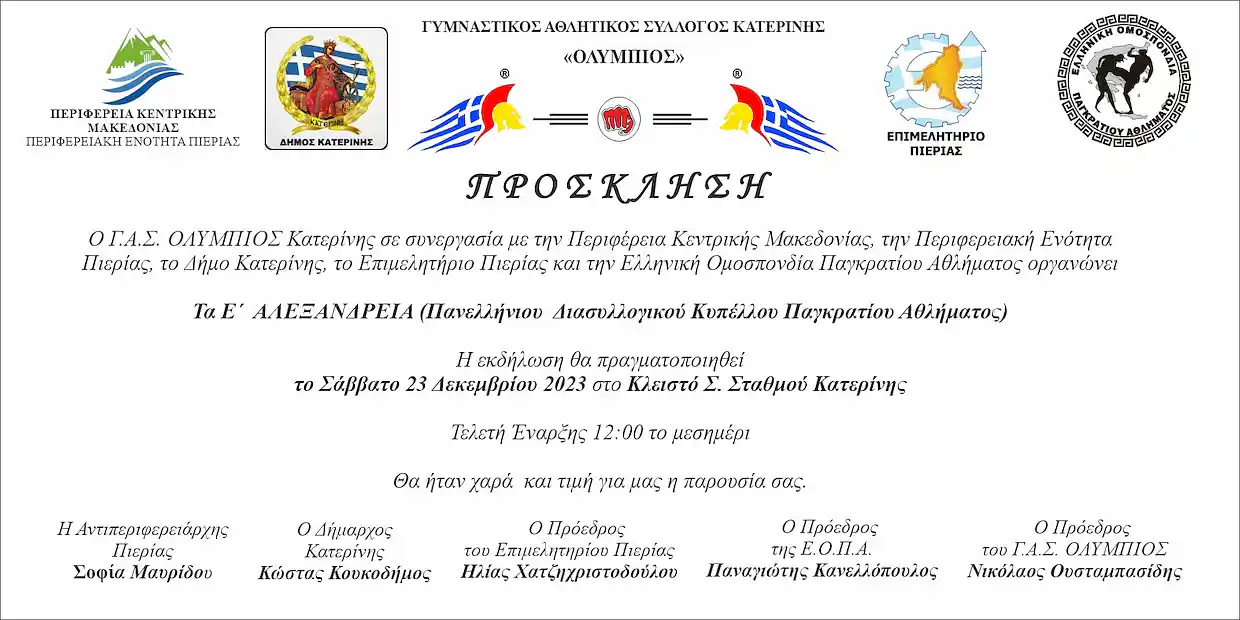 Η Κατερίνη φιλοξενεί τα Ε’ ΑΛΕΞΑΝΔΡΕΙΑ (Πανελλήνιο Διασυλλογικό Κύπελλο Παγκρατίου Αθλήματος) Η Κατερίνη φιλοξενεί τα Ε’ ΑΛΕΞΑΝΔΡΕΙΑ (Πανελλήνιο Διασυλλογικό Κύπελλο Παγκρατίου Αθλήματος) Η Κατερίνη φιλοξενεί τα Ε’ ΑΛΕΞΑΝΔΡΕΙΑ (Πανελλήνιο Διασυλλογικό Κύπελλο Παγκρατίου Αθλήματος)
