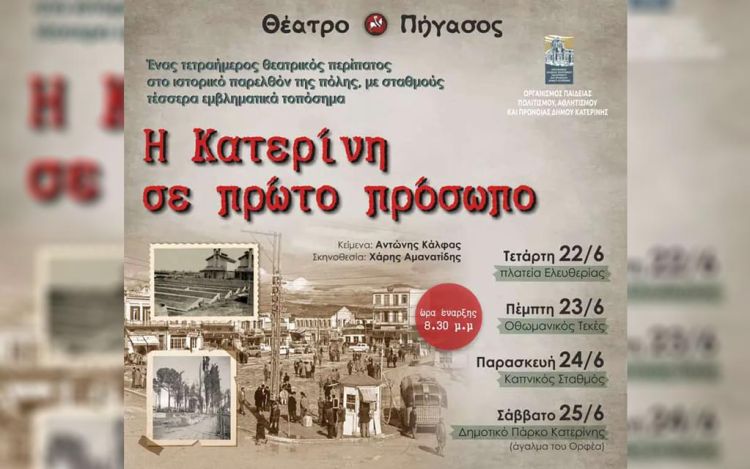 Έναν τετραήμερο θεατρικό περίπατο στο ιστορικό παρελθόν της πόλης παρουσιάζει το θέατρο ΠΗΓΑΣΟΣ στο πλαίσιο των καλοκαιρινών πολιτιστικών εκδηλώσεων του Οργανισμού Πολιτισμού (ΟΠΠΑΠ) του Δήμου Κατερίνης.