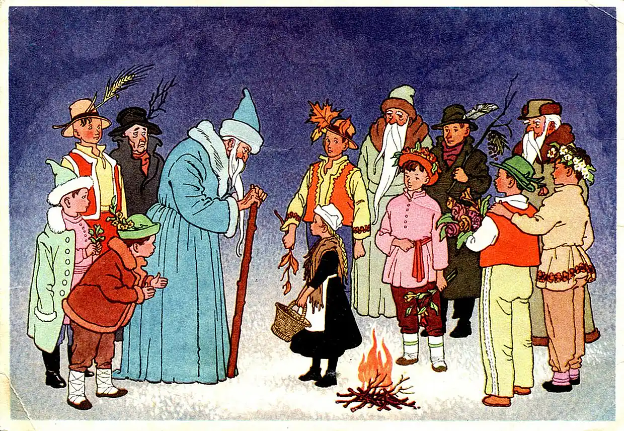 Για καλή της τύχη όμως, εκεί παραδίπλα, υπήρχε μια καλύβα που ποτέ άλλοτε δεν την είχε προσέξει. Λες κι εμφανίστηκε μαγικά εκείνη τη στιγμή. Χωρίς να το σκεφτεί και πολύ, πλησίασε και χτύπησε την πόρτα. Της άνοιξαν αμέσως και μπήκε μέσα. Στο καθιστικό, ένα μεγάλο τζάκι έκαιγε για τα καλά και μπροστά του καθόταν ένας συμπαθητικός γέρος με μια άσπρη μακριά γενειάδα. Γύρω του υπήρχαν δώδεκα όμορφα παλικάρια. Τα τρία φορούσαν γούνες, τρία είχαν στα μαλλιά τους στεφάνια από λουλούδια, τρία είχαν στεφάνια από στάχυα και τα τρία τελευταία φορούσαν στεφάνια από σταφύλια. Η κυρά Καλή τα έχασε μα δεν φοβήθηκε.