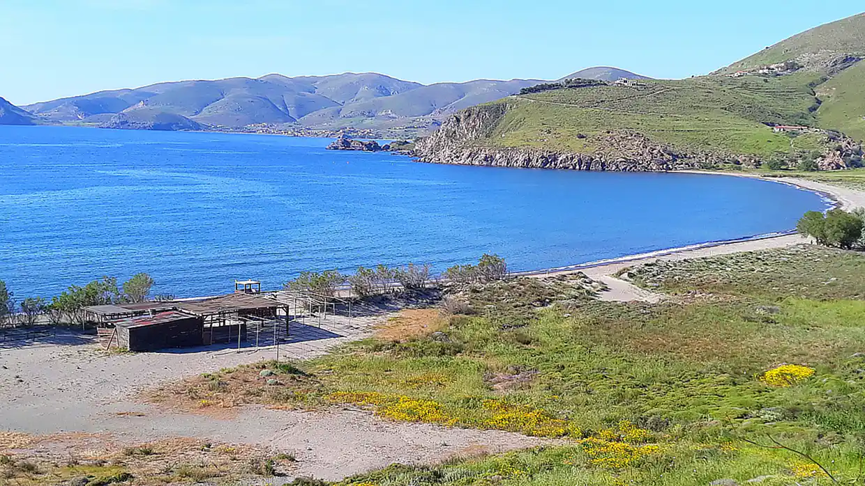 Η θάλασσα είναι πάντα ήσυχη, χωρίς κύματα, γιατί δεν την πιάνει ο αέρας. Στο βάρος διακρίνεται ο Αη Γιάννης Κάσπακα, 8 χιλιόμετρα από τη Μύρινα, με τις δικές του εκπληκτικές αμμουδερές παραλίες. Αριστερά στο βάθος είναι το Άγιο Όρος με τα μαγικά ηλιοβασιλέματα.