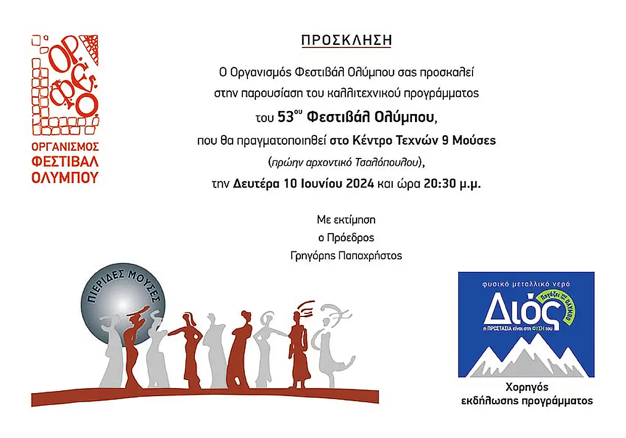 Κατά το εθιμικό η γνωστοποίηση του καλλιτεχνικού προγράμματος υλοποιείται στην Κατερίνη, όπου και φέτος ο Οργανισμός Φεστιβάλ Ολύμπου θα παρουσιάσει το επίσημο πρόγραμμα των εκδηλώσεων του 53ου Φεστιβάλ Ολύμπου.