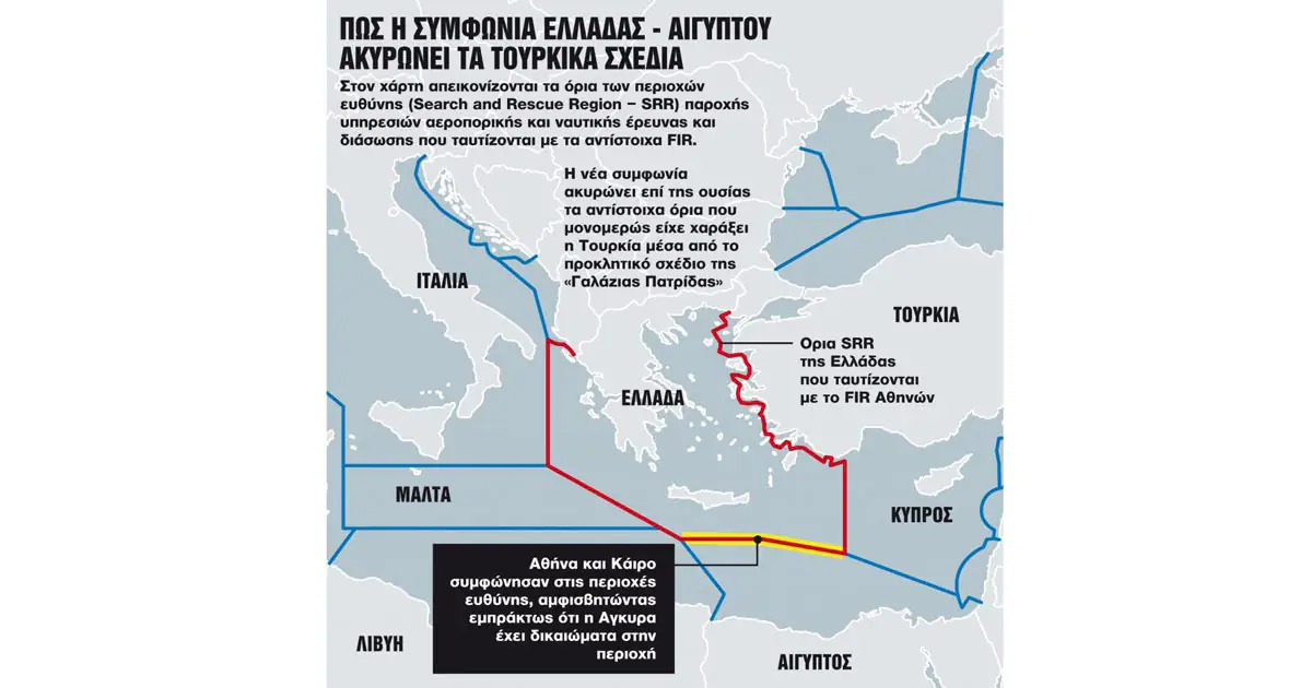 Η συμφωνία Ελλάδας – Αιγύπτου για την έρευνα και διάσωση που υπέγραψαν οι υπουργοί Αμυνας έρχεται να απαντήσει και στη μονομερή επέκταση του εύρους της περιοχής έρευνας και διάσωσης της Τουρκίας το 2020 στα όρια της «Γαλάζιας Πατρίδας», ενώ θεωρείται και μια κίνηση που αποσκοπεί στην ενίσχυση των ελληνικών θέσεων απέναντι στο τουρκολιβυκό μνημόνιο του 2019. Και δη σε περιστατικά έρευνας και διάσωσης που η Τουρκία επιχειρεί πάγια να εργαλειοποιήσει. Σύμφωνα με τη διακρατική συμφωνία που υπεγράφη χθες οριοθετούνται διμερώς, όπως δηλαδή προβλέπεται στη σχετική Διεθνή Σύμβαση του 1979, οι περιοχές ευθύνης τους στα περιστατικά Ερευνας και Διάσωσης, στις περιοχές εκείνες που συμπίπτουν με τα FIR Αθηνών και Καΐρου. Βάσει αυτής προβλέπεται η κοινή δράση των δύο πλευρών στις εκατέρωθεν οριοθετημένες περιοχές.