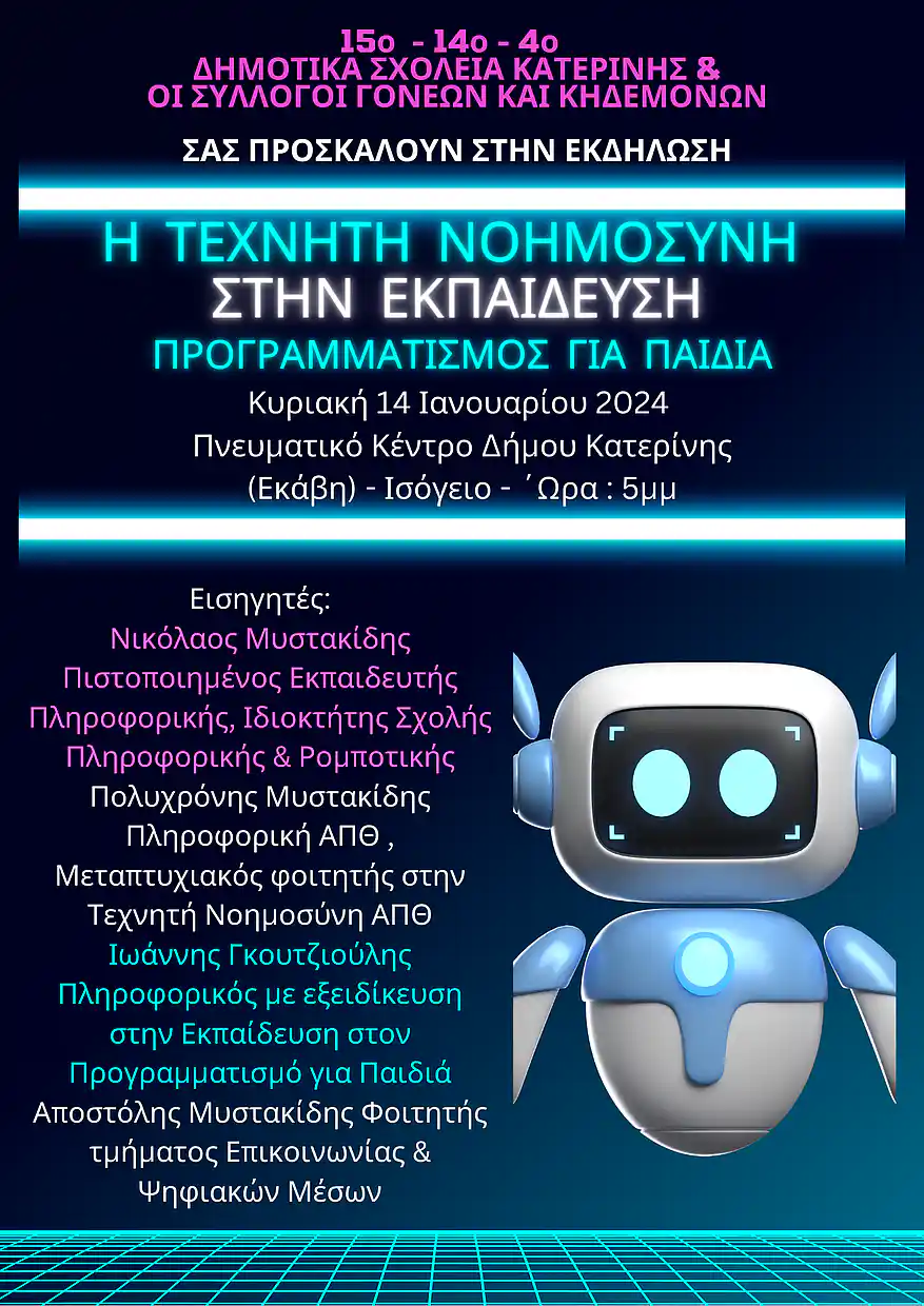 Η «Τεχνητή Νοημοσύνη στην Εκπαίδευση – Προγραμματισμός για παιδιά» αποτελεί το θεματολόγιο της εσπερίδας την οποία συνδιοργανώνουν από κοινού τρία Δημοτικά Σχολεία Κατερίνης, τα 15ο, 14ο και 4ο, σε συνεργασία με τους Συλλόγους Γονέων και Κηδεμόνων.