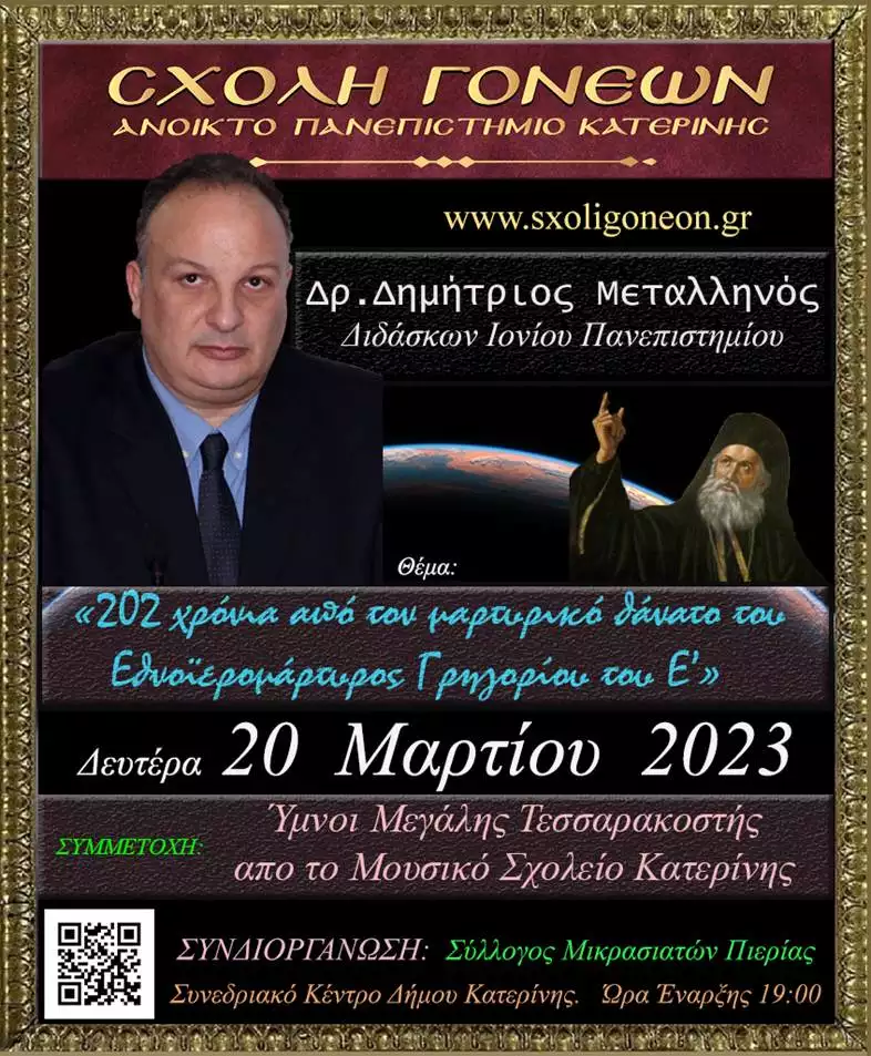 Με την τελευταία εκδήλωση της για την Ακαδημαϊκή χρονιά 2022-2023 και με αφορμή τα 202 χρόνια από τον μαρτυρικό θάνατο του Εθνοιερομάρτυρος Γρηγορίου του Ε’