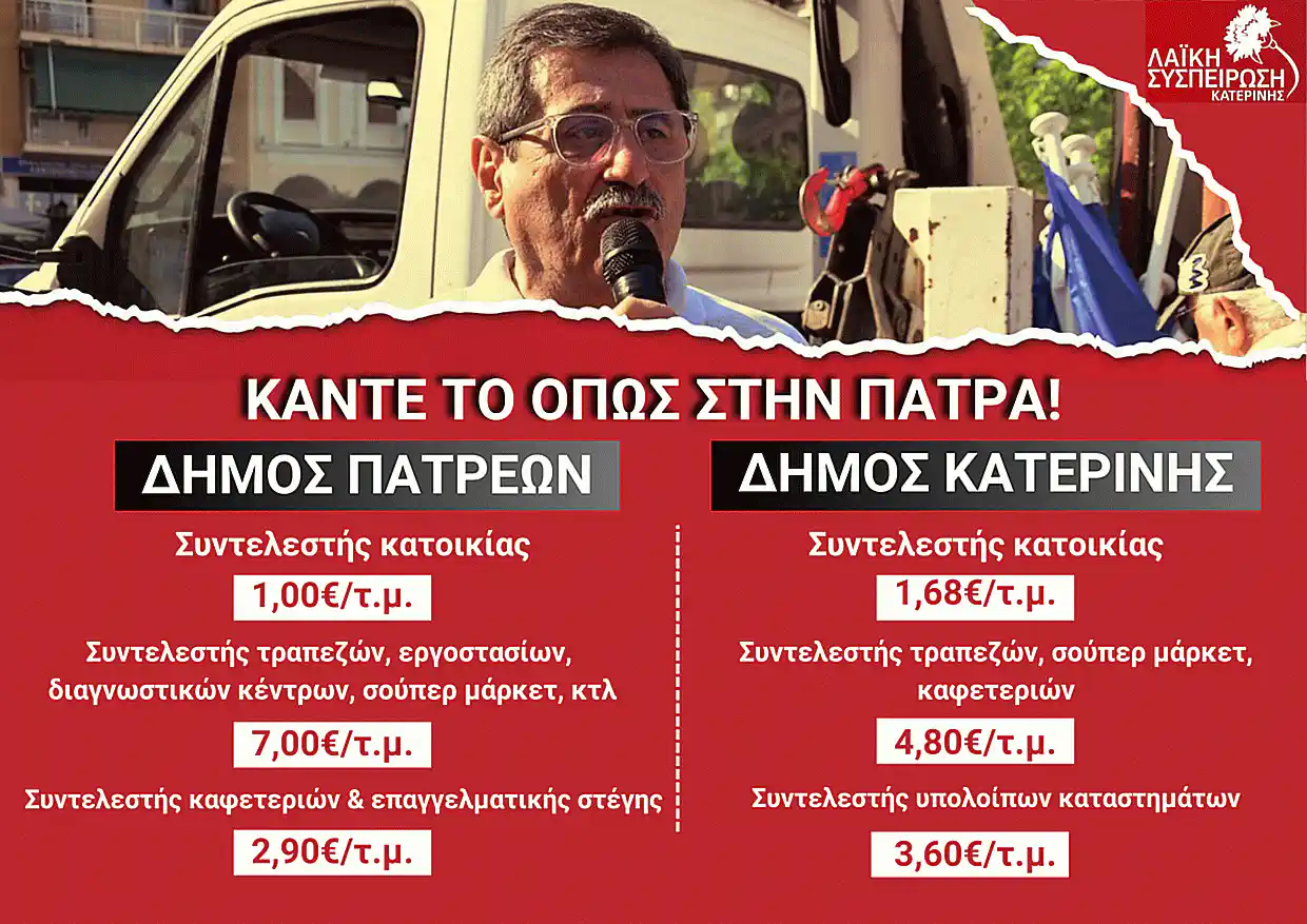Έτσι, ο δήμος Πετρούπολης έχει από τα χαμηλότερα τέλη οικιακού τιμολογίου, ο δήμος Πάτρας από τα χαμηλότερα δημοτικά τέλη στην οικιακή κατηγορία και στην επαγγελματική στέγη, η Καισαριανή έβαλε τέλος στο airbnb και μηδενικά τροφεία στους παιδικούς σταθμούς, στο Χαϊδάρι δίνουμε μάχη για την απόδοση των τελών από τα ναυπηγεία.