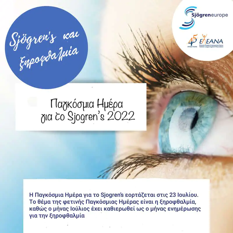 Με αφορμή τον εορτασμό της Παγκόσμιας Ημέρας για το Sjögren’s, η Ελληνική Εταιρεία Αντιρευματικού Αγώνα και η SJÖGREN EUROPE (Ευρωπαϊκή Ομοσπονδία Συλλόγων Ασθενών με Sjögren’s) τονίζουν ότι η ξηροφθαλμία, που ταλαιπωρεί περίπου 95% των ασθενών, εξακολουθεί να υποδιαγιγνώσκεται και να υποθεραπεύεται.