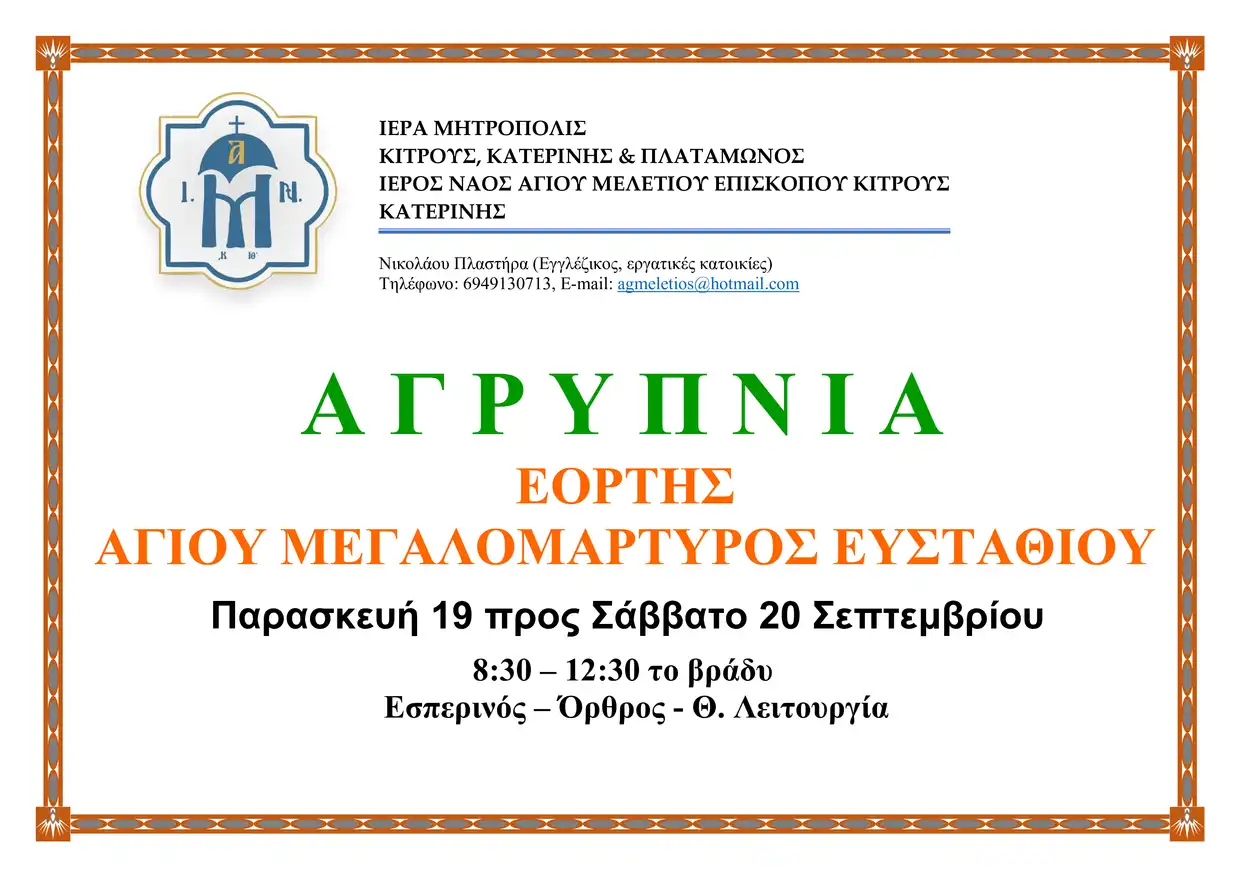 Ιερά Αγρυπνία στον Ιερό Ναό Αγίου Μελετίου Κατερίνης