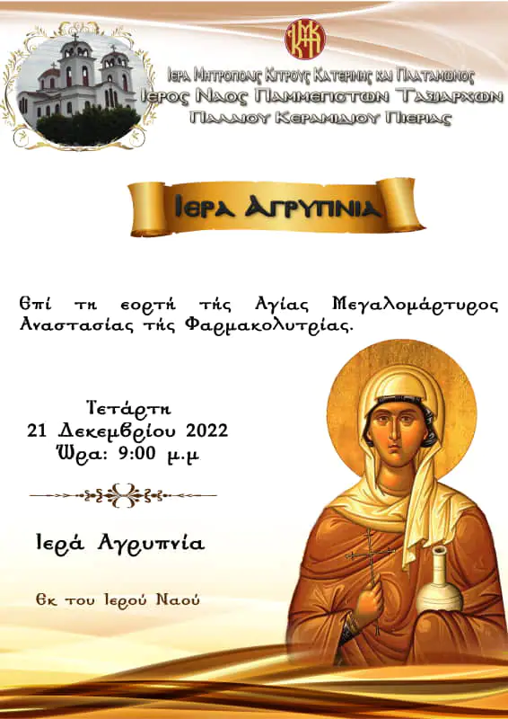 Ιερά Αγρυπνία της Αγίας Αναστασίας της Φαρμακολυτρίας