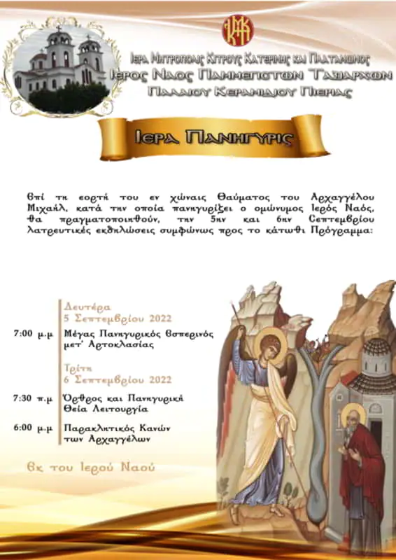 Επί τη εορτή του εν χώναις Θαύματος του Αρχαγγέλου Μιχαήλ, κατά την οποία πανηγυρίζει ο ομώνυμος Ιερός Ναός, θα πραγματοποιηθούν , την 5ην και 6ην Σεπτεμβρίου λατρευτικές εκδηλώσεις συμφώνως προς το κάτωθι Πρόγραμμα: