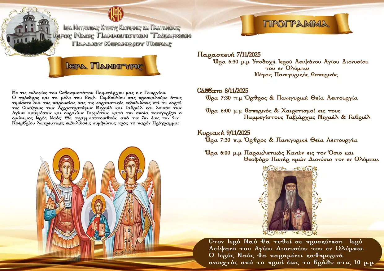 Με τις ευλογίες του Σεβασμιωτάτου Ποιμενάρχου κ.κ. Γεωργίου, η ενορία των Παμμεγίστων Ταξιαρχών Παλαιού Κεραμιδίου Πιερίας προσκαλεί τους πιστούς να συμμετάσχουν στις εορταστικές εκδηλώσεις προς τιμήν των Αρχιστρατήγων Μιχαήλ και Γαβριήλ και πάντων των Αγίων Ασωμάτων και Ουρανίων Δυνάμεων.