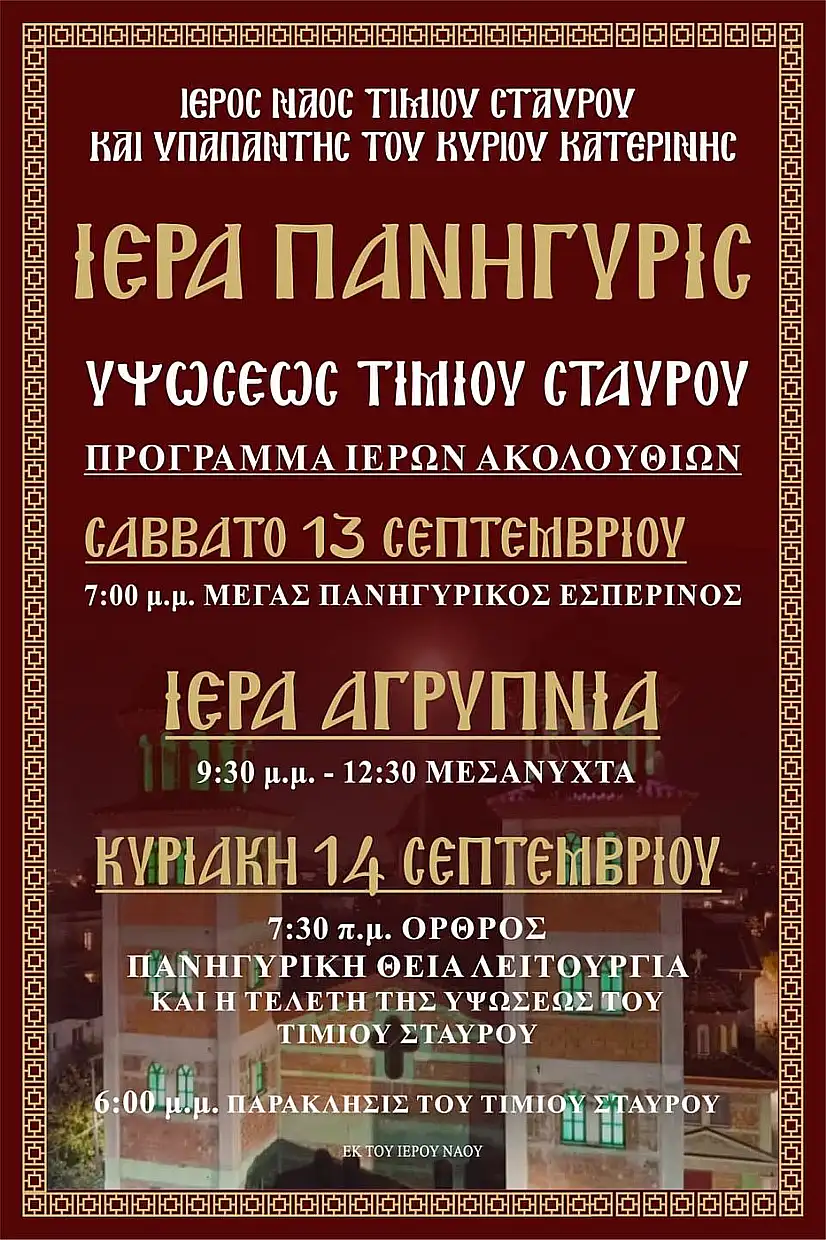 Με ιδιαίτερη λαμπρότητα θα εορταστεί η Ύψωση του Τιμίου Σταυρού στον Ιερό Ναό Τιμίου Σταυρού και Υπαπαντής του Κυρίου στην Κατερίνη. Το πρόγραμμα των ιερών ακολουθιών έχει ως εξής:
