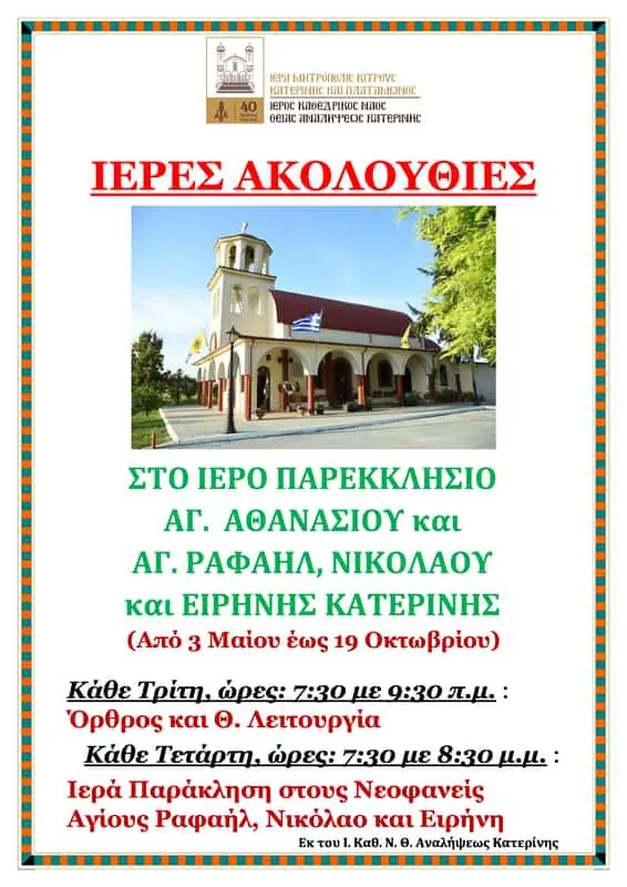 Ιερές ακολουθίες στο Παρεκκλήσιο Αγίου Αθανασίου και Αγ. Ραφαήλ, Νικολάου και Ειρήνης  Κατερίνης
