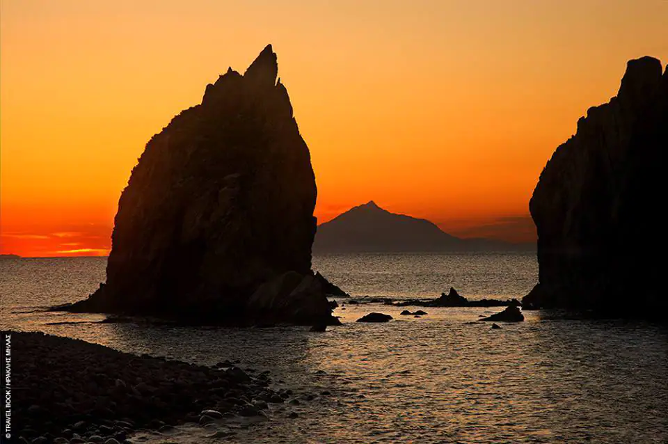 Όταν λοιπόν το βραδάκι ο ήλιος βασιλεύει πίσω από τον Άθω, η εικόνα είναι μαγική. Έχεις την αίσθηση ότι το Αιγαίο είναι μια τεράστια λίμνη, μέσα από την οποία στο βάθος αναδύεται το Άγιο όρος, με τον Άθω να στεφανώνεται από χρυσοκόκκινα συννεφάκια, ενώ οι βάρκες των ψαράδων στο ανοιχτό πέλαγος στολίζουν σαν σημαδάκια τη γαλαζοπράσινη επιφάνεια της θάλασσας.Ηλιοβασίλεμα 500 ευρώ