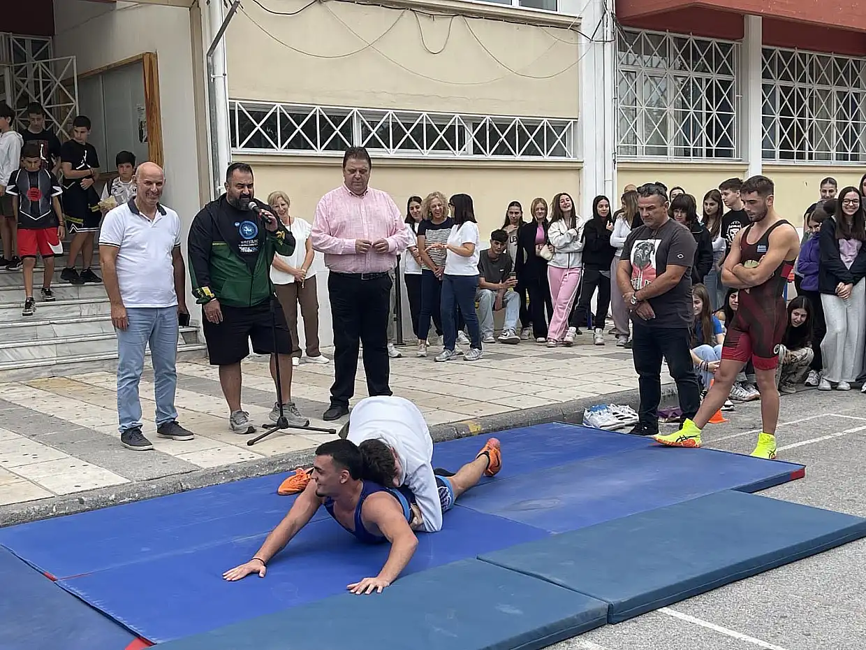 Η συγκεκριμένη μέρα εμπλουτίστηκε και από τις επιδείξεις αθλημάτων διακεκριμένων μαθητών μας. Ο μαθητής της Γ’ Τάξης Σουλής Δημήτριος, χρυσός πρωταθλητής Ελλάδας και ασημένιος παγκόσμιος πρωταθλητής στο άθλημα της πάλης, έκανε επίδειξη του αθλήματός του μαζί με τον προπονητή του Συλλόγου του Αρχελάου, κ. Τσεντίδη Σάββα και τον βαλκανιονίκη και πρωταθλητή Ελλάδας, κ. Βούλγαρη Μενέλαο. Οι μαθητές θαύμασαν τις επιδόσεις των αθλητών μας και συμμετείχαν και οι ίδιοι εθελοντικά σε απλές κινήσεις που τους έδειξαν.