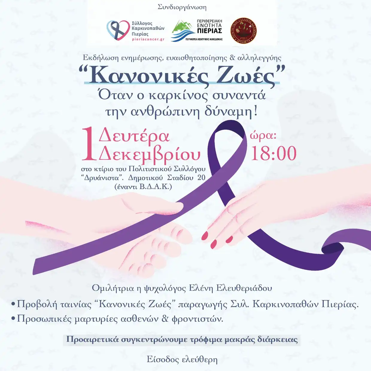 Σε μια πρωτοβουλία με έντονο κοινωνικό αποτύπωμα, ο Πολιτιστικός Σύλλογος Δρυάνιστα Κατερίνης, σε συνεργασία με τον Σύλλογο Καρκινοπαθών Πιερίας και με τη στήριξη της Περιφερειακής Ενότητας Πιερίας, διοργανώνουν μια εκδήλωση αφιερωμένη στην ενημέρωση και την πρόληψη γύρω από τη νόσο του καρκίνου. Η δράση, με τον χαρακτηριστικό τίτλο «Κανονικές Ζωές», έρχεται να ανοίξει έναν απαραίτητο διάλογο για μια ασθένεια που αγγίζει άμεσα ή έμμεσα χιλιάδες ανθρώπους.