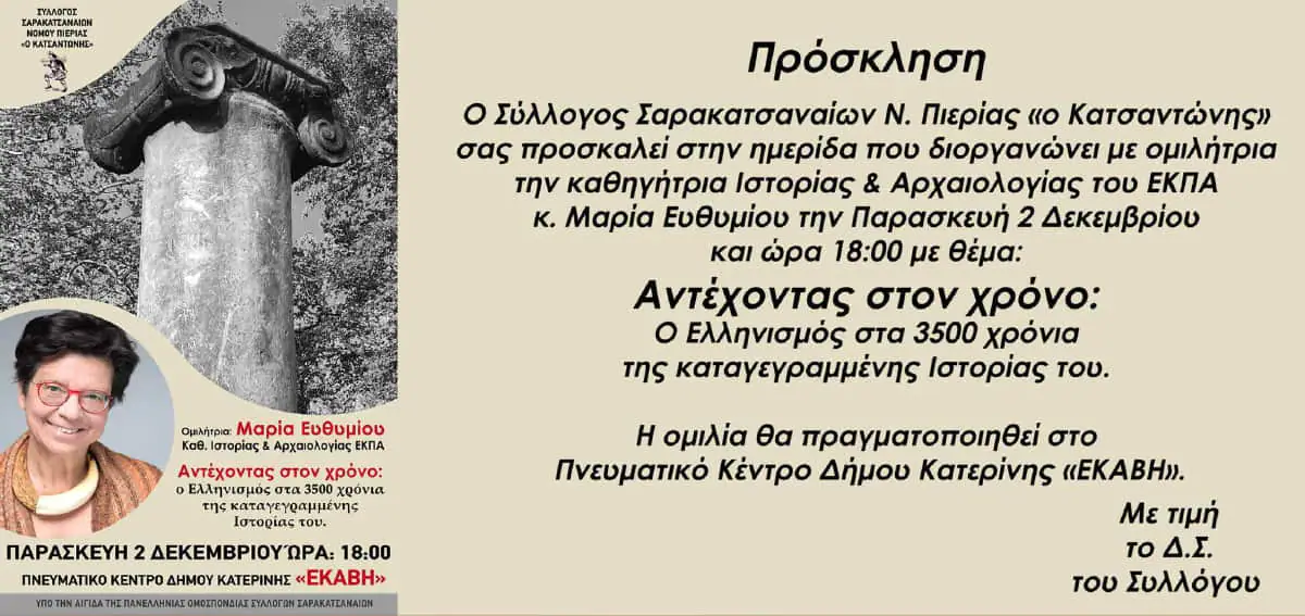 Ο Ελληνισμός στα 3500 χρόνια της καταγεγραμμένης ιστορίας του προσκεκλημένη η κα Μαρία Ευθυμίου καθηγήτρια Ιστορίας και Αρχαιολογίας του ΕΚΠΑ.