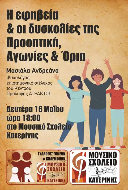 Σήμερα Δευτέρα 16 Μαΐου στις 18:00 στην αίθουσα του πρώην ΚΕΓΕ στο Μουσικό Σχολείο Κατερίνης, θα πραγματοποιηθεί ημερίδα σε συνεργασία με το Κέντρο Πρόληψης Πιερίας “Άτρακτος” με θέμα “Η εφηβεία και οι δυσκολίες της – Προοπτική, Αγωνίες και Όρια”. Εισηγήτρια θα είναι η ψυχολόγος κ. Ανδρεάνα Μασιάλα.