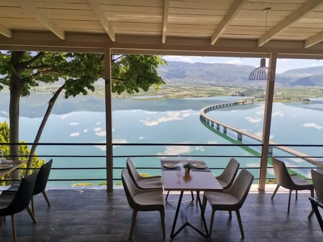 Από την μεριά της εκκλησίας είναι οι ταβέρνες & οι καφετέριες. Έχουν υπέροχη θέα προς την λίμνη (του φράγματος Πολυφύτου) και την γέφυρα που διασχίζει τη λίμνη (μήκος 1.372 μ. – ύψος 55 μ.).