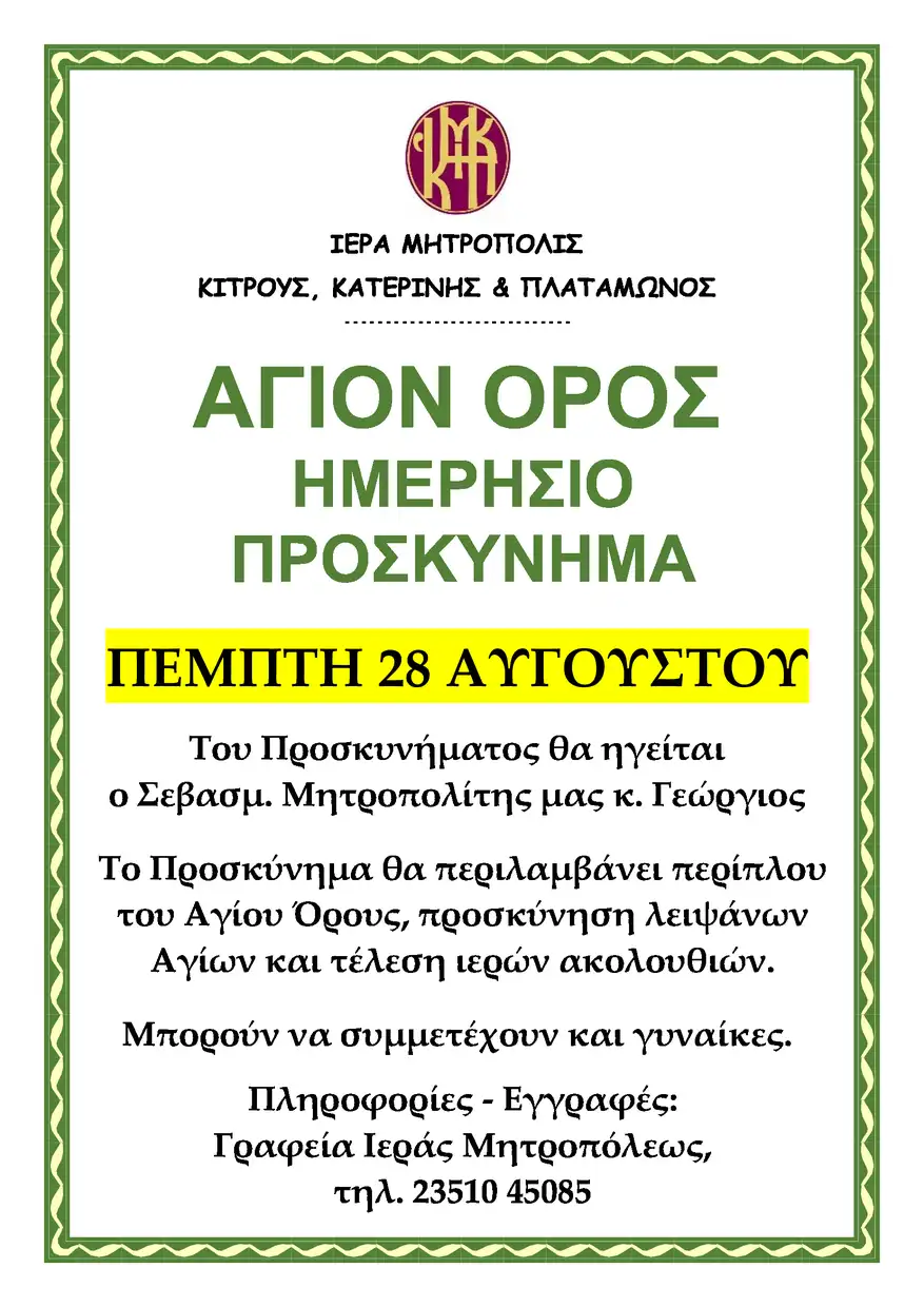 Η Ιερά Μητρόπολη Κίτρους, Κατερίνης και Πλαταμώνος διοργανώνει ημερήσιο προσκύνημα στο Άγιον Όρος την Πέμπτη 28 Αυγούστου, με επικεφαλής τον Σεβασμιώτατο Μητροπολίτη κ. Γεώργιο.