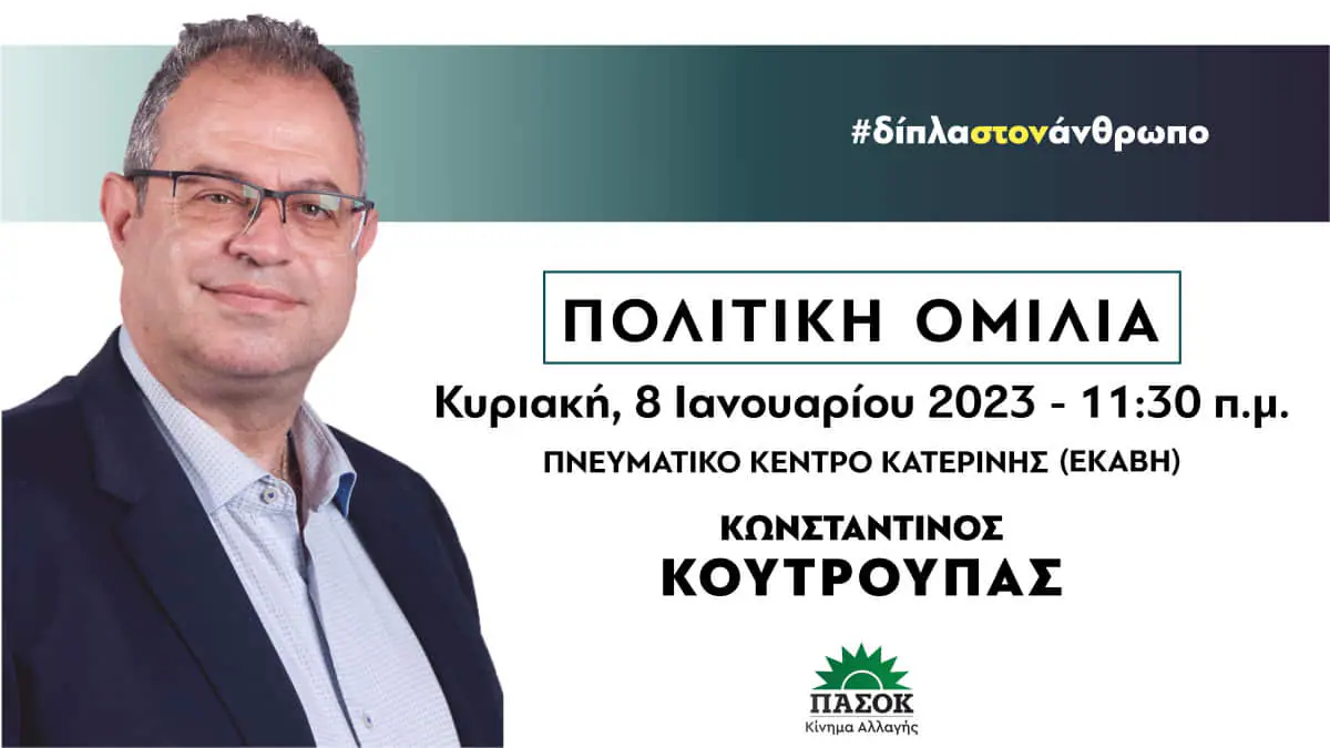 Πολιτική ομιλία θα πραγματοποιήσει ο χειρουργός ΩΡΛ Κωνσταντίνος Κουτρούπας αυτήν την Κυριακή 8 Ιανουαρίου 2023, στις 11:30 πμ, στο Πνευματικό Κέντρο Κατερίνης (ΕΚΑΒΗ).