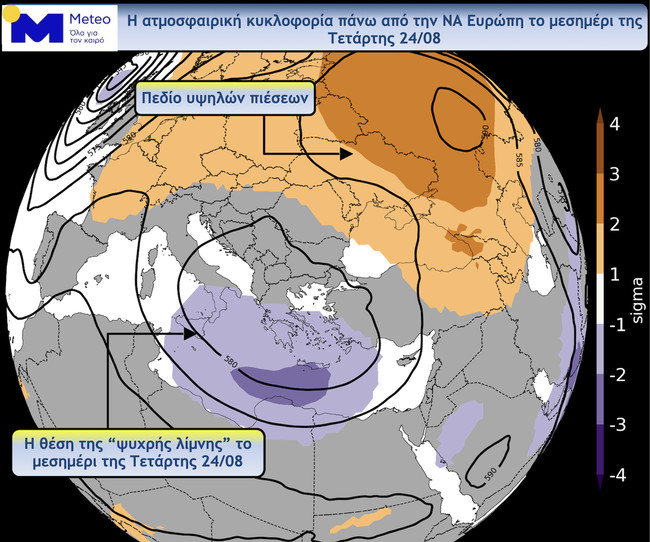 Κύρια χαρακτηριστικά του καιρού κατά τη διάρκεια της Τετάρτης 24/08 θα είναι (Γραφικό 2) οι βροχές και καταιγίδες τόσο σε ηπειρωτικά όσο και σε νησιωτικά τμήματα κυρίως του Αιγαίου.