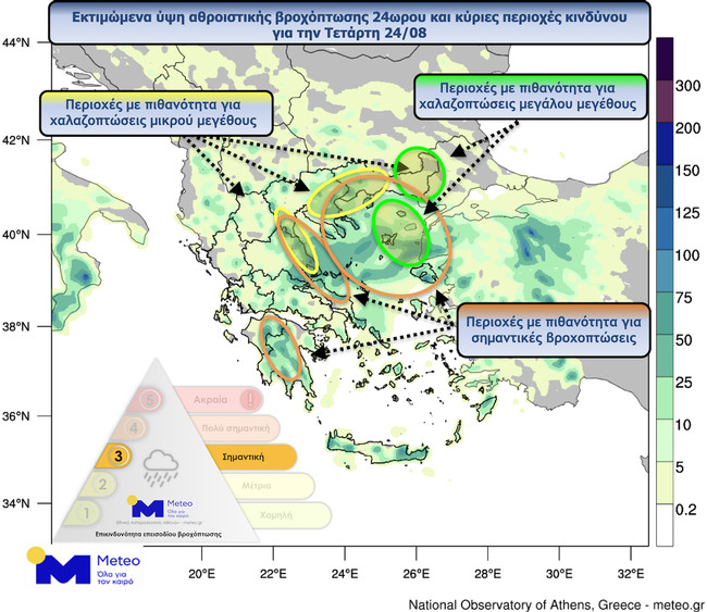 Ο παρακάτω χάρτης δείχνει τον αθροιστικό υετό που αναμένεται κατά την διάρκεια της Τετάρτης 24/08 και συνοψίζει τις κυριότερες περιοχές υψηλού κινδύνου.