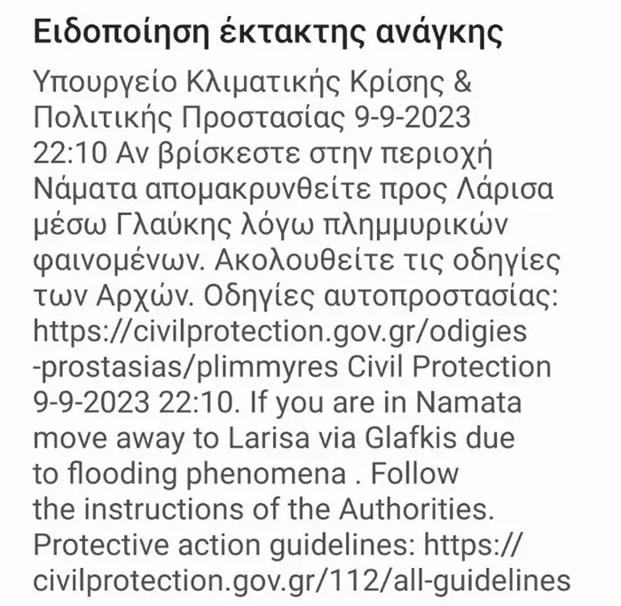 Νέα επείγουσα ειδοποίηση από το Υπουργείο Κλιματική Κρίσης και Πολιτικής Προστασίας αργά το βράδυ προέτρεψε όσους βρίσκονται στο χωριό Νάματα του δήμου Κιλελέρ να απομακρυνθούν προς τη Λάρισα λόγω των πλημμυρικών φαινομένων.