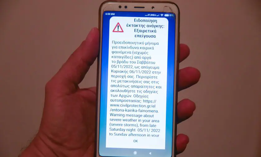 Λίγο μετά τις 22.00 χτες το βράδυ 5/11, μήνυμα στα κινητά τους από το 112 έλαβαν οι κάτοικοι της Θεσσαλονίκης ενώ μισή ώρα αργότερα, στις 22.30 εστάλησαν προειδοποιητικά μηνύματα για επικίνδυνα καιρικά φαινόμενα σε Πιερία, Ημαθία, Πέλλα, Χαλκιδική και Εύβοια.
