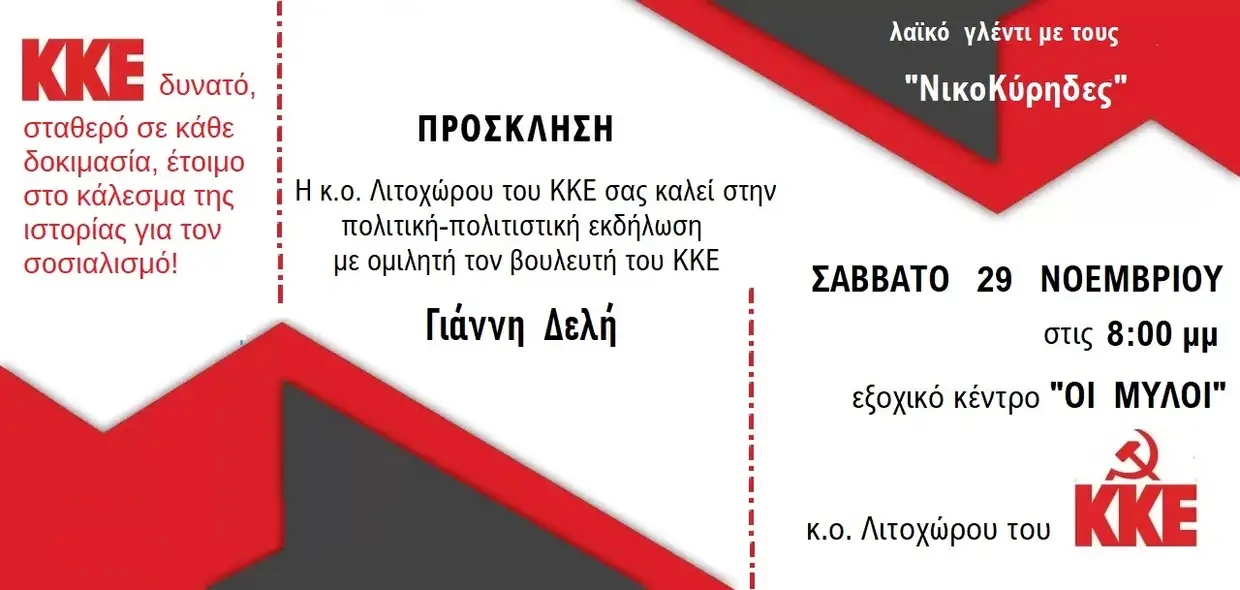 Το ΚΚΕ πραγματοποιεί συνεστίαση στο Λιτόχωρο, το Σάββατο 29/11 στους Μύλους με ομιλητή τον βουλευτή του Κόμματος Γιάννη Δελή καθώς επίσης και